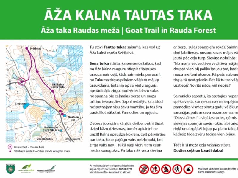 Der Volkspfad führt zum Heiligen Hain auf dem Bockhügel. Eine alte Legende besagt, dass in alten Zeiten, als sich die Straße über den Rücken vom Bockhügel erstreckte, fuhr ein Bauer im Frühjahr mit vollem Wagen vom Markt in Tukums nach Hause. An diesem Ort wurde er müde, hielt das Pferd an, trank Birkensaft aus einem Eimer neben einer Birke am Straßenrand und schlief für eine Weile ein. Er träumte, dass er alle seine Besitztümer dem Bösen versprach, wenn er ihm die Zukunft zeigen würde. Der Bauer wachte auf und war verwirrt. Der Himmel war immer noch heiter, die Vögel sangen ihre Hochzeitslieder wie vorher, aber der Mann kannte die Umgebung nicht mehr! Der Hügel war mit Bäumen bewachsen, der Weg hatte sich in einen Pfad verwandelt, der nicht mehr mit einem Wagen befahrbar war, kein Pferd mehr zu sehen – nur ein leerer Wagen, von Haselbäumen durchgewachsen. Eine alte Frau mit Eimern der Birkensaft in den Händen kam den Weg entlang. Der Bauer grüßte sie, nannte den Namen seines Gehöfts und fragte nach dem Weg dorthin. Die Frau wunderte sich: „Vom Haus des Großvaters meines Urgroßvaters waren bereits nur Ruinen übriggeblieben, als ich ein kleines Mädchen war. Er war zum Markt gefahren und nie zurückgekommen. Wie hast du aber den Wagen hierhergeschleppt? Ich bin hier am Morgen vorbeigekommen, er war noch nicht da!“ Der Bauer begriff, dass er an einem ungewöhnlichen Ort angehalten hatte, an dem nichts unmöglich war, und dass er mindestens hundert Jahre später aufgewacht war und jetzt mit seiner Ururenkelin sprach. "Zeichen und Wunder!", rief er aus, nahm der Frau die Eimer aus der Hand, und beide gingen den breiten Pfad hinunter, der einst ein schmaler Tierpfad gewesen war.