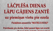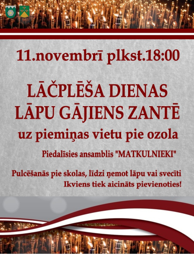 Lāčplēša dienas lāpu gājiens, no Zantes pamatskolas līdz piemiņas vietai pie ozola. Par patriotisku atmosfēru parūpēsies ansamblis “Matkulnieki”. Pulcēšanās vieta: Zantes pamatskola, Skolas iela 14, Zante, Tukuma novads. Gājiena sākums: plkst. 18:00