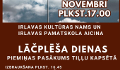 Lāčplēša dienas svinīgais pasākums Tiļļu kapsētā. Tiem kas nevar paši nokļūt iespēja doties kopā 16:45 no Irlavas centra stāvlaukuma. Pulcēšanās vieta: Tiļļu kapsēta, Irlavas pagasts, Tukuma novads. Pasākuma sākums: plkst. 17:00