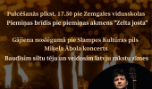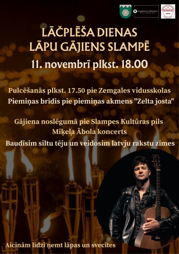 Lāpu gājiens no Zemgales vidusskolas līdz piemiņas akmenim “Zelta josta”, noslēdzot pie Slampes Kultūras pils ar muzikālu programmu, siltu tēju un latvju rakstu zīmju veidošanu no svecēm. Pulcēšanās vieta: Zemgales vidusskola, Slampe, Tukuma novads. Gājiena sākums: plkst. 18:00