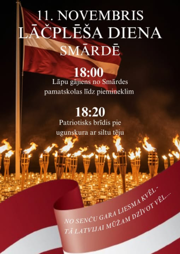 Lāpu gājiens no Smārdes pamatskolas līdz karavīru piemineklim “Vēju dārzā”, godinot Latvijas brīvības cīnītājus. Pulcēšanās vieta: Smārdes pamatskola, Smārde, Tukuma novads. Gājiena sākums: plkst. 18:00