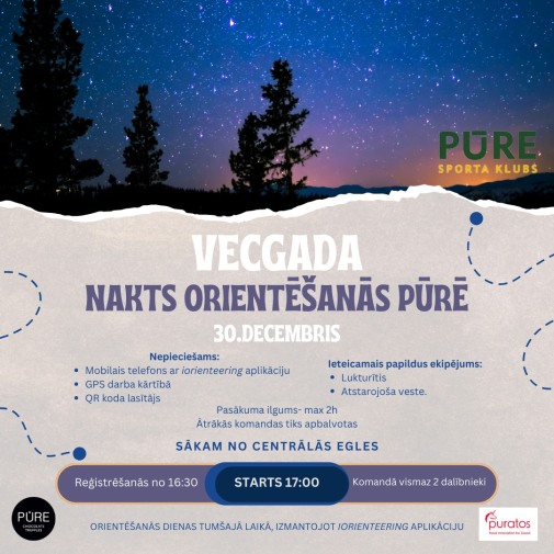 Vecā gada nakts orientēšanās Pūrē aicinās piedzīvot aktīvu un aizraujošu gada noslēgumu ziemīgā noskaņā. Tumsā izgaismots piedzīvojums pārbaudīs orientēšanās prasmes, ātrumu un komandas sadarbību, pārvēršot Vecgada vakaru dinamiskā izaicinājumā. Dalībniekiem būs iespēja apvienot kustību ar sacensību garu, sekojot maršrutam un risinot uzdevumus digitālā vidē. Šis būs neierasts un enerģisks veids, kā Veco gadu pavadīt kustībā un ar piedzīvojuma garšu. Sākuma vieta: piePūres centrālās egles, Pūre, Pūres pagasts, Tukuma novads. Norises laiks: 30.12.2025 plkst. 17:00. Dalība: bez maksas. Vairāk informācijas: 26181525