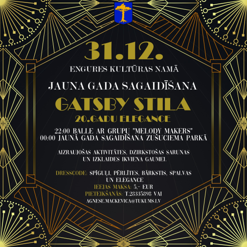 Engures kultūras nams gadu mijā pārtaps par greznu 20to gadu iedvesmotu svinību telpu, kur valdīs elegance, šarms un svētku mirdzums. Balles ritmu noteiks grupa “Melody Makers”, radot īstu Gatsby laikmeta noskaņu ar izsmalcinātu skanējumu. Apmeklētāji aicināti savā apģērbā iekļaut atbilstošu apģērbu, papildinot vakaru ar spīguļiem, bārkstīm un glamūru. Aicinājums ņemt līdzi groziņus. Norises vieta: Engures kultūras nams, Jūras iela 85, Engure, Engures pagasts, Tukuma novads. Norises laiks: 31.12.2025 plkst. 22:00. Ieejas maksa: 5 EUR. Vairāk informācijas: 28335898