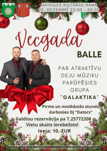 Vecgada pavadīšanas ieskaņas balle Matkulē aicinās pavadīt vakaru sirsnīgā un dzīvespriecīgā atmosfērā. Par muzikālo noskaņu rūpēsies grupa “Galaktika”, piedāvājot dejas un labi zināmas melodijas visa vakara garumā. Pasākums norisināsies pie galdiņiem, radot mājīgu vidi sarunām, dejām un kopīgai svinēšanai. Šī būs lieliska iespēja veco gadu pavadīt ar mūziku, smaidiem un labu noskaņojumu. Norises vieta: Matkules kultūras nams, "Tūjas", Matkule, Matkules pagasts, Tukuma novads. Norises laiks: 30.12.2025 plkst. 22:00. Ieejas maksa: 10 EUR. Vairāk informācijas: 25772208