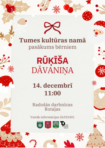 Pasākums Tumes kultūras namā svētdienas rītā pārvērtīsies par jautru piedzīvojumu, kad bērni dosies meklēt pazudušo dāvaniņu. Dienu krāsos rotaļas, spēles un sportiskas aktivitātes, savukārt radošās darbnīcas ļaus izpaust fantāziju. Siltumu papildinās gardā tējiņa un cepumiņu baudīšana, radot īstu svētku prieku. Norises vieta: Tumes kultūras nams, Pasta iela 1A, Tume, Tumes pagasts, Tukuma novads. Norises laiks: 14.12.2025 plkst. 11:00. Ieeja: bez maksas. Vairāk informācijas: 26332401