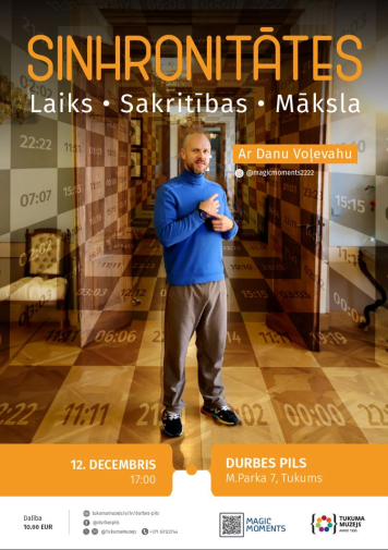 Piektdienas vakara pasākums “Sinhronitātes” Durbes pilī piedāvās iedvesmojošu ceļojumu, kurā tiks atklātas laika mistērijas, enerģijas plānošanas noslēpumi un sinhronitātes mākslā. Klausītāji varēs iegrimt pārdomās un sajust radošu iedvesmu, kurā vēsture saplūdīs ar tagadni. Dana Voļevaha vadībā vakars kļūs par neaizmirstamu pieredzi ar maģiskām atklāsmēm. Norises vieta: Durbes pils, M. Parka iela 7, Tukums. Norises laiks: 12.12.2025 plkst. 17:00. Ieejas maksa: 10 EUR. Vairāk informācijas: 20503600 vai 26305946, www.tukukmamuzejs.lv
