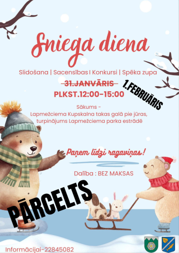 Svētdien Lapmežciema pludmalē valdīs īsta ziemas prieka un kustības atmosfēra visai ģimenei. Kopīgais piedzīvojums sāksies ar ragaviņu braucienu gar jūru, ļaujot izbaudīt ziemu piekrastes noskaņās. Turpinājumā būs jautras aktivitātes, sacensības un rotaļas, kas vienos lielus un mazus. Sarkani vaigi, smaidi un ziemas baudīšana kopā radīs siltas atmiņas par kopā pavadīto laiku. Noslēgumā silta zupa visiem dalībniekiem. Norises vieta: pludmale Kupskalna dabas takas galā, Lapmežciems, Lapmežciema pagasts, Tukuma novads. Norises laiks: 01.02.2026 plkst. 12:00. Dalība: bez maksas. Vairāk informācijas: 22845082