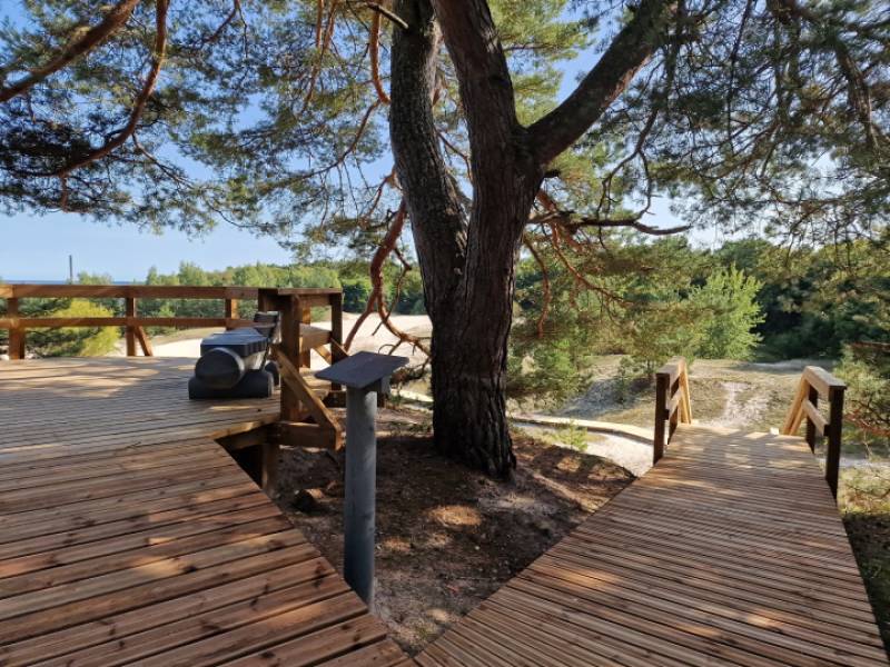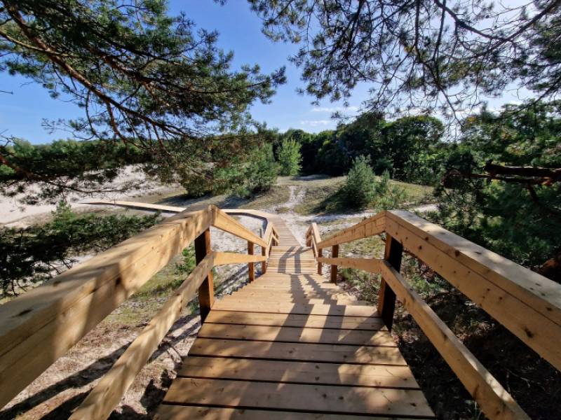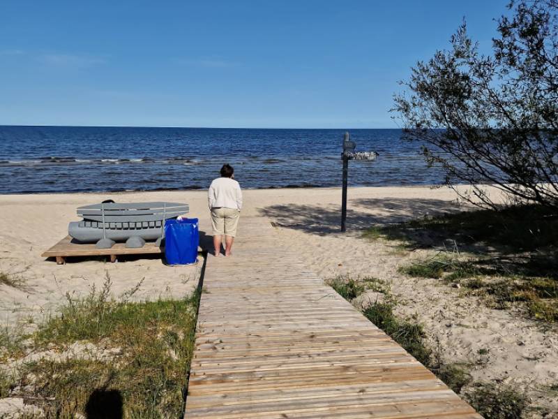 Taka aizvedīs no ceļa līdz pat jūrai, vedot gājējus pāri kāpas valnim. Takas segums veidots tā, ka taka pieejama gan cilvēkiem ratiņkrēslos (vēlams ar pavadoni), gan ģimenēm ar bērniem ratiņos. Pludmalē ir gan ģērbtuve, gan neliels rotaļu laukums. Uz takas speciāli veidotas vietas, lai apmainītos vietām ar pretīmnākošajiem, nav.