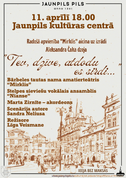 Amatiermākslas teātra “Mirklis” izrāde “Tev, dzīve, atdodu es sirdi” iepazīstinās ar Aleksandra Čaka dzeju, mūziku un patiesu ...