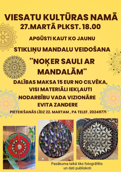 Radošajā meistarklasē “Noķer sauli ar mandalām” būs iespēja apgūt stikliņu mandalu veidošanas prasmes un ļauties mierpilnam ...