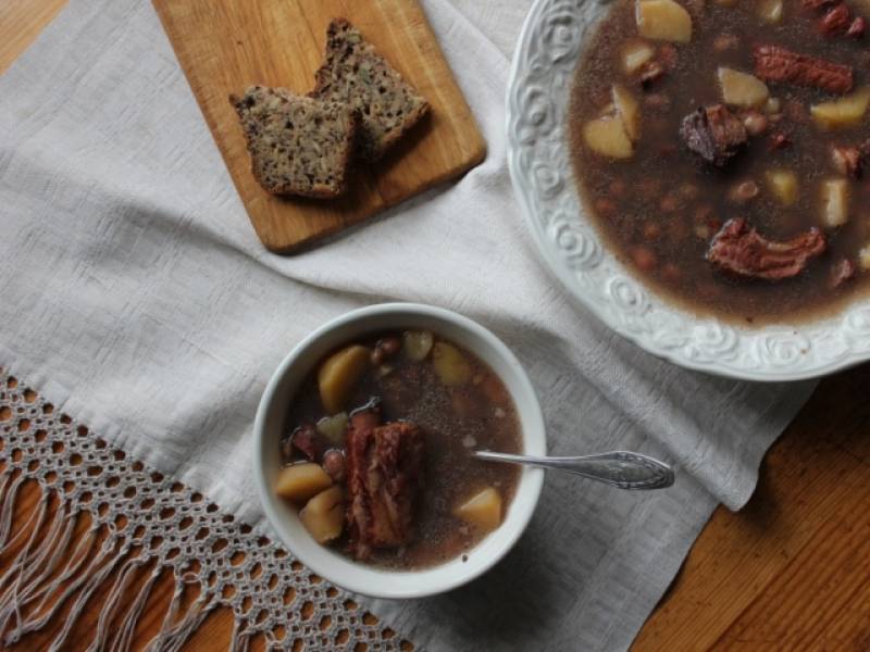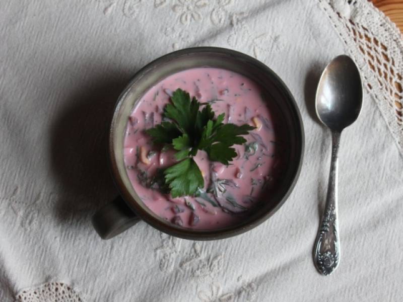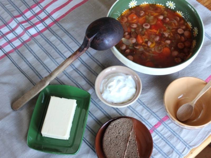 Супы: пестрый овощной суп с поджаренным бутербродом с сыром; суп с колбасками по-кангарски; холодный суп с зеленью; суп из фасоли с копченым мясом