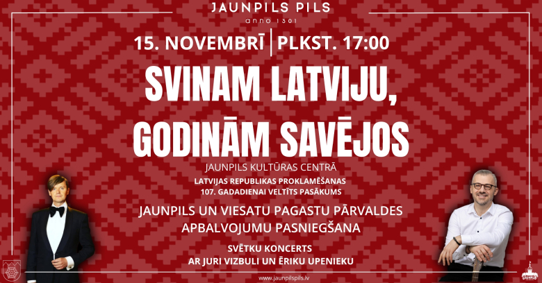 Jaunpils kultūras centrā notiks svētku pasākums, veltīts Latvijas Republikas 107. gadadienai. Vakars sāksies ar svinīgām uzrunām, godinot Jaunpils un Viesatu pagastu iedzīvotājus par nozīmīgu ieguldījumu kopienas attīstībā. Pasākumu turpinās svētku koncerts, kurā muzicēs Ēriks Upenieks un Juris Vizbulis, radot siltu un patriotisku noskaņu. Norises vieta: Jaunpils pils, Jaunpils, Tukuma novads. Norises laiks: 15.11.2025 plkst. 17:00. Ieeja: bezmaksas. Vairāk informācijas: 26101458