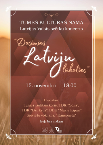Latvijas valsts svētku koncerts “Dosimies Latviju lūkoties” aicinās piedzīvot sirsnīgu un patriotisku kopā būšanu. Uz skatuves kāps Tumes Kultūras nama kori, dejotāji un vokālie ansambļi, ar dziesmām un dejām, izstāstot Latvijas stāstu. Pasākums veltīts cilvēkiem, tradīcijām un mūsu zemei. Norises vieta: Tumes Kultūras nams, Pasta iela 1A, Tume, Tumes pagasts, Tukuma novads. Norises laiks: 15.11.2025 plkst. 18:00. Ieeja: bezmaksas. Vairāk informācijas: 26332401