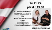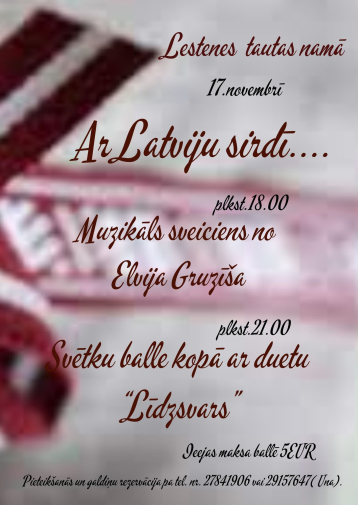 Valsts svētku pasākums “Ar Latviju sirdī…” būs veltīts Latvijas neatkarības dienai, godinot valsts brīvību un tās cilvēku spēku. Vakaru bagātinās muzikāls sveiciens no Elvija Gruzīša, radot sirsnīgu un patriotisku gaisotni. Norises vieta: Lestenes Tautas nams, Lestene, Lestenes pagasts, Tukuma novads. Norises laiks: 17.11.2025 plkst. 18:00. Ieeja: bezmaksas. Vairāk informācijas: 27841906