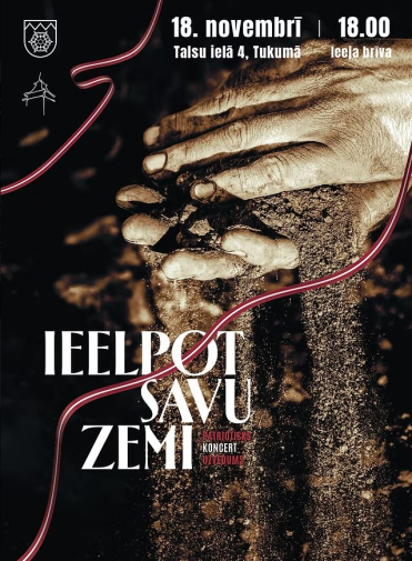 Koncertuzvedums “Ieelpot savu zemi” - Valsts svētku vakars laukumā pie Tukuma novada domes ikvienam atnākušajam piedāvās patriotiskas noskaņas, ko radīs un apvienos dziesmas, dejas un citi muzikāli pārsteigumi. Tukuma Raiņa Valsts ģimnāzijas jauniešu kora sniegumu papildinās TDA “Svīta” un TDA “Svīta” studijas dejotāji. Pasākums radīs siltu un svinīgu noskaņu, ļaujot piedzīvot Latvijas garu caur mākslu. Norises vieta: Talsu iela 4, Tukums. Norises laiks: 18.11.2025 plkst. 18:00. Ieejas maksa: Bezmaksas. Vairāk informācijas: 28344637