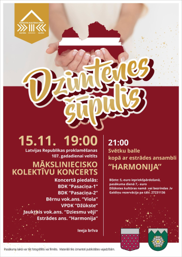 Koncerts “Dzimtenes šūpulis” veltīts Latvijas Republikas proklamēšanas dienai, izceļot dziesmu un bērnu kolektīvu radošumu. Uz skatuves kāps BDK “Pasaciņa-1” un “Pasaciņa-2”, bērnu vokālais ansamblis “Viola”, VPDK “Džūkste”, jauktais vokālais ansamblis “Dziesmu vēji” un estrādes ansamblis “Džūkstes Harmonija”. Pasākums piedāvās sirsnīgu un patriotisku svētku noskaņu, ļaujot kopā svinēt Latvijas stāstu caur mūziku. Norises vieta: Džūkstes Kultūras nams, “Biedrību nams”, Džūkste, Džūkstes pagasts, Tukuma novads. Norises laiks: 15.11.2025 plkst. 19:00. Ieeja: bezmaksas. Vairāk informācijas: 27231136