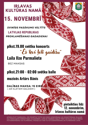Valsts svētku pasākums “Es Tevi ļoti gaidīšu” Irlavā piedāvās emocionālu muzikālu programmu kopā ar Lailu Ilzi Purmalieti. Koncerts aicinās uz pārdomām par dzimteni, piederību un cilvēku stāstiem, kas veido Latvijas spēku. Norises vieta: Irlavas Kultūras nams, “Svēteļi”, Irlava, Irlavas pagasts, Tukuma novads. Norises laiks: 15.11.2025 plkst. 19:00. Ieeja: bezmaksas. Vairāk informācijas: 28668486