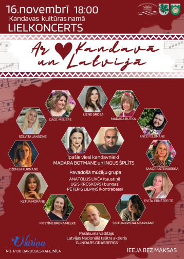 Kandavas Kultūras nama lielajā zālē izskanēs svētku lielkoncerts “Ar sirdi Kandavā un Latvijā”, kurā piedalīsies dažādi dziedātāji un mūziķi, radot sirsnīgu un vienojošu svētku noskaņu. Muzikālo pavadījumu nodrošinās Anatolija Livčas vadītā grupa, bet pasākumu vadīs aktieris Gundars Grasbergs. Norises vieta: Kandavas Kultūras nams, Lielā iela 28, Kandava, Tukuma novads. Norises laiks: 16.11.2025 plkst. 18:00. Ieeja: bezmaksas. Vairāk informācijas: 25771108
