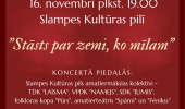 Svētku koncerts “Stāsts par zemi, ko mīlam” Latvijas Republikas proklamēšanas dienas svinībās piedāvās amatiermākslas kolektīvu veidotu koncertprogrammu, godinot mīlestību pret Latviju un tās vērtībām. Uz skatuves kāps TDK “Laisma”, VPDK “Namejs”, SDK “Jumis”, folkloras kopa “Pūrs”, amatierteātri “Spārni” un “Fēnikss”. Koncertā notiks arī Slampes pagasta Pateicības rakstu pasniegšana, atzīstot ieguldījumu pagasta attīstībā. Norises vieta: Slampes Kultūras pils, Slampe, Slampes pagasts, Tukuma novads. Norises laiks: 16.11.2025 plkst. 19:00. Ieeja: bezmaksas. Vairāk informācijas: 20005704