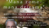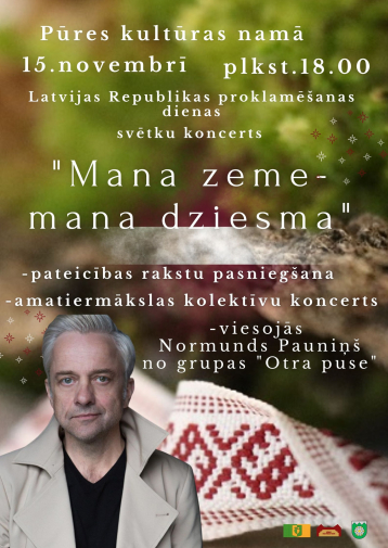 Svētku koncerts “Mana zeme – mana dziesma” būs Pūres amatiermākslas kolektīvu koncerts, veltīts Latvijas valsts svētkiem, izceļot dziesmas, dejas un kopības spēku. Skatuvi piepildīs sirsnīgas melodijas un patriotisks noskaņojums, kas aicinās sajust lepnumu par savu zemi. Pasākuma īpašais viesis – Normunds Pauniņš, kurš ar muzikālu sveicienu bagātinās svētku atmosfēru. Norises vieta: Pūres Kultūras nams, “Vārpas”, Pūre, Pūres pagasts, Tukuma novads. Norises laiks: 15.11.2025 plkst. 18:00. Ieejas maksa: Bezmaksas. Vairāk informācijas: 29100681