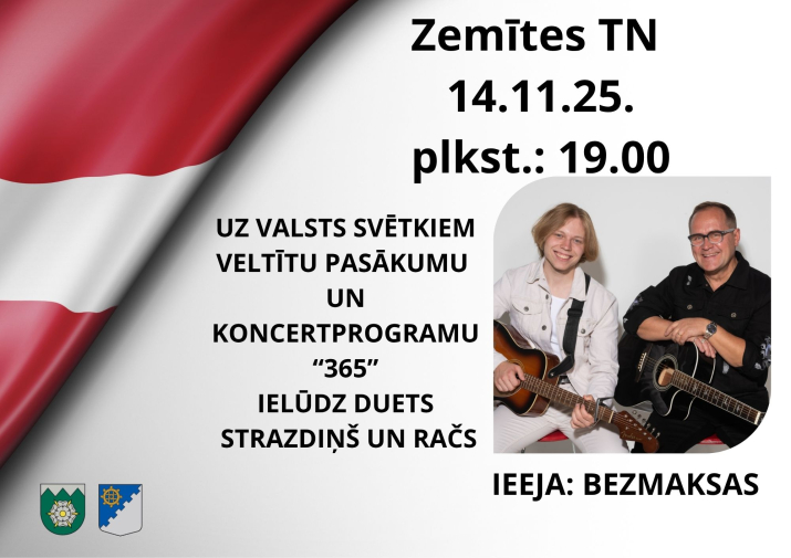 Valsts svētku laikā Zemītē izskanēs koncertprogramma “365”, kurā muzicēs Eduards Strazdiņš un Guntars Račs. Tas būs muzikāls piedzīvojums, kas veltīts Latvijai un tās ikdienas stāstam caur dziesmām un emocijām. Norises vieta: Zemītes Tautas nams, “Cerības”, Zemīte, Zemītes pagasts, Tukuma novads. Norises laiks: 14.11.2025 plkst. 19:00. Ieeja: bezmaksas. Vairāk informācijas: 26527265