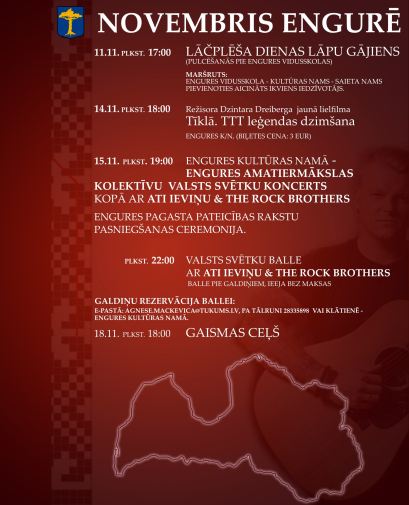 Valsts svētku koncertā Engurē uzstāsies amatiermākslas kolektīvi kopā ar Ati Ieviņu un grupu “The Rocket Brothers”. Svētku gaitā notiks arī svinīga pagasta Pateicības rakstu pasniegšanas ceremonija. Norises vieta: Engures Kultūras nams, Jūras iela 85, Engure, Engures pagasts, Tukuma novads. Norises laiks: 15.11.2025 plkst. 19:00. Ieeja: bezmaksas. Vairāk informācijas: 28335898