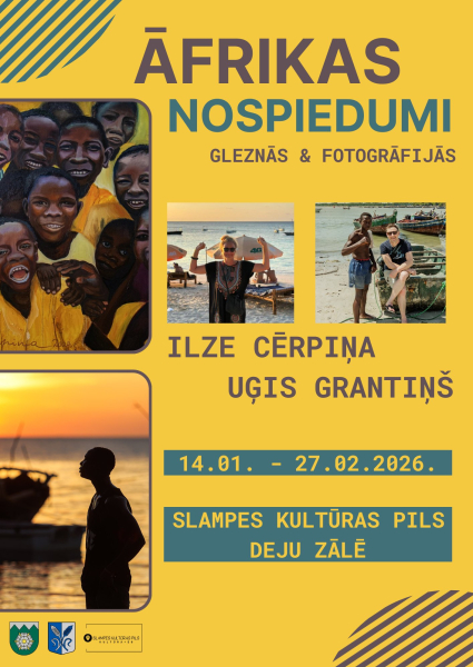 Slampes Kultūras pils deju zālē būs skatāma Ilzes Cērpiņas gleznu un Uģa Grantiņa fotogrāfiju izstāde Āfrikas noskaņās.