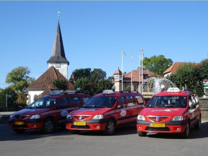 Diennakts taksometru pakalpojumi Tukumā. Sarkanās krāsas taksometri ir "Taxi-Tukums" automašīnas. Pakalpojumiem izmantojamas 4 vieglās automašīnas (4 pasažieru vietas katrā).