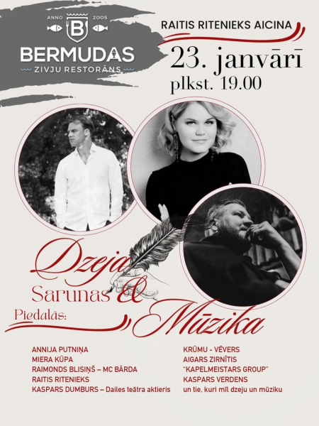 Bermudas zivju restorānā valdīs vārdu, domu un skaņu satikšanās, kur dzeja savīsies ar sarunām un dzīvo mūziku. Vakars solīsies būt piepildīts ...