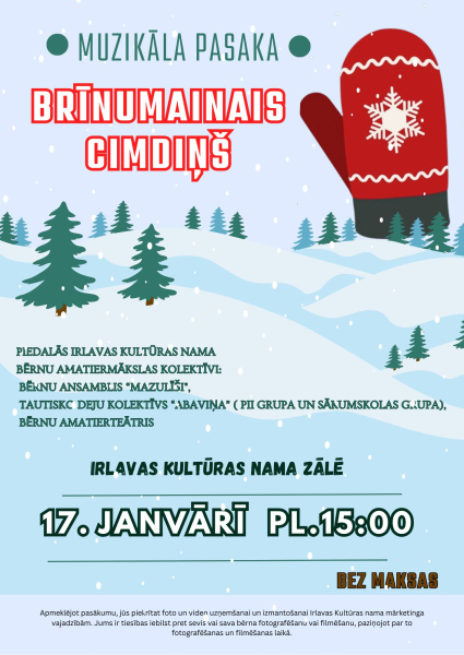 Irlavas kultūras nama bērnu amatiermākslas kolektīvi sniegs muzikālu Ziemassvētku izrādi, pēc kuras bērniem būs iespēja piedalīties radošās aktivitātēs, spēlēs un izklaidēs kopā ar Rūķiem.