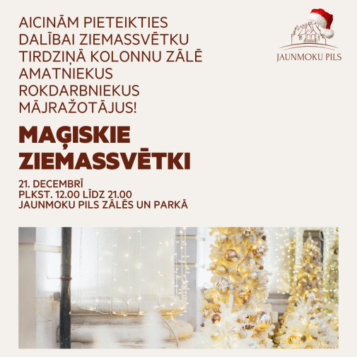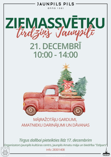 Рождественская ярмарка состоится на 4-е воскресенье Адвента - 21 декабря, когда двор замка Яунпилс превратится в тёплую и уютную рождественскую сказку. В воздухе будут витать ароматы домашних лакомств, разнообразие изделий местных мастеров и настоящая праздничная магия. Каждый торговый столик и каждая улыбка создадут особенное зимнее настроение, а Дед Мороз принесёт радость и взрослым, и детям. Тёплая атмосфера, праздничная музыка и мерцание огоньков перенесут гостей в настоящий дух Рождества.